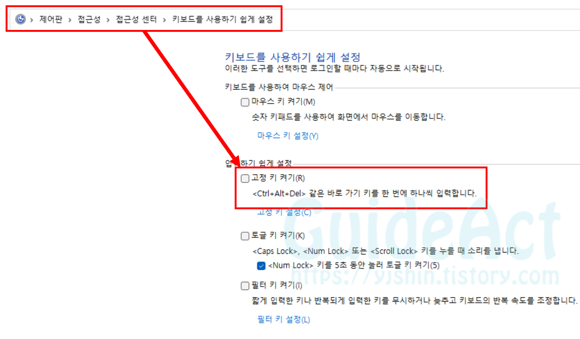 - 제어판 > 접근성 > 키보드 작동 방법 변경