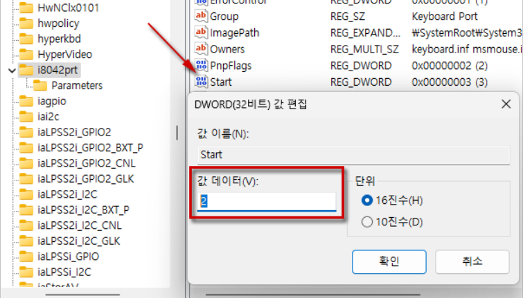 - HKEY_LOCAL_MACHINE\SYSTEM\CurrentControlSet\Services\i8042prt 경로로 이동합니다.