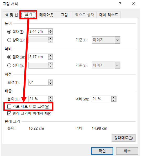 크기 탭으로 이동한 후 배율 아래에 있는 가로 세로 비율 고정(A)을 체크 해제합니다.