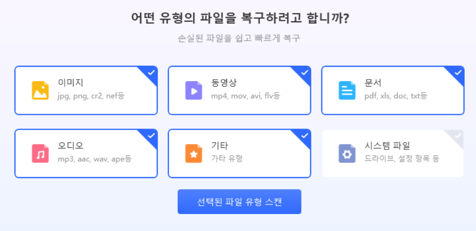 다음과 같이 파일 유형을 선택하여 스캔을 무료로 진행할 수 있습니다.