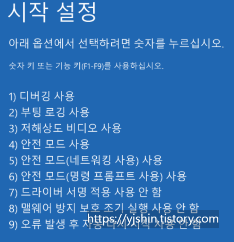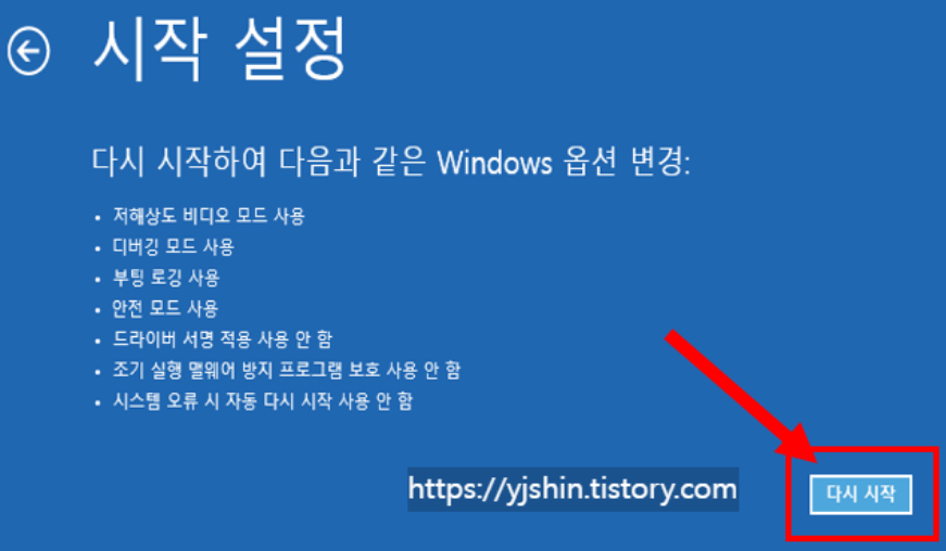 - "문제 해결" -> "고급 옵션" -> "시작 설정" -> "다시 시작"을 선택합니다.