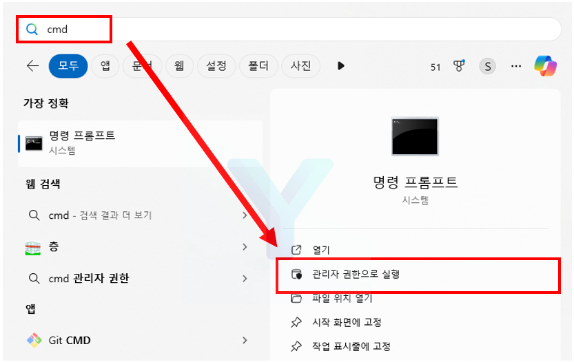 Windows 검색창에 "cmd"를 입력하고, 명령 프롬프트를 관리자 권한으로 실행합니다.