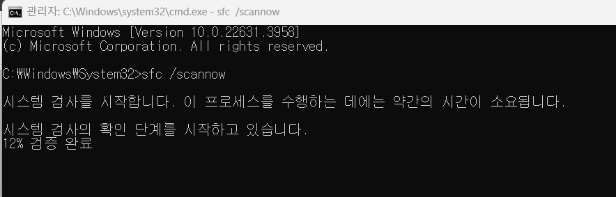 sfc /scannow 명령어를 입력하고 Enter 키를 누릅니다.