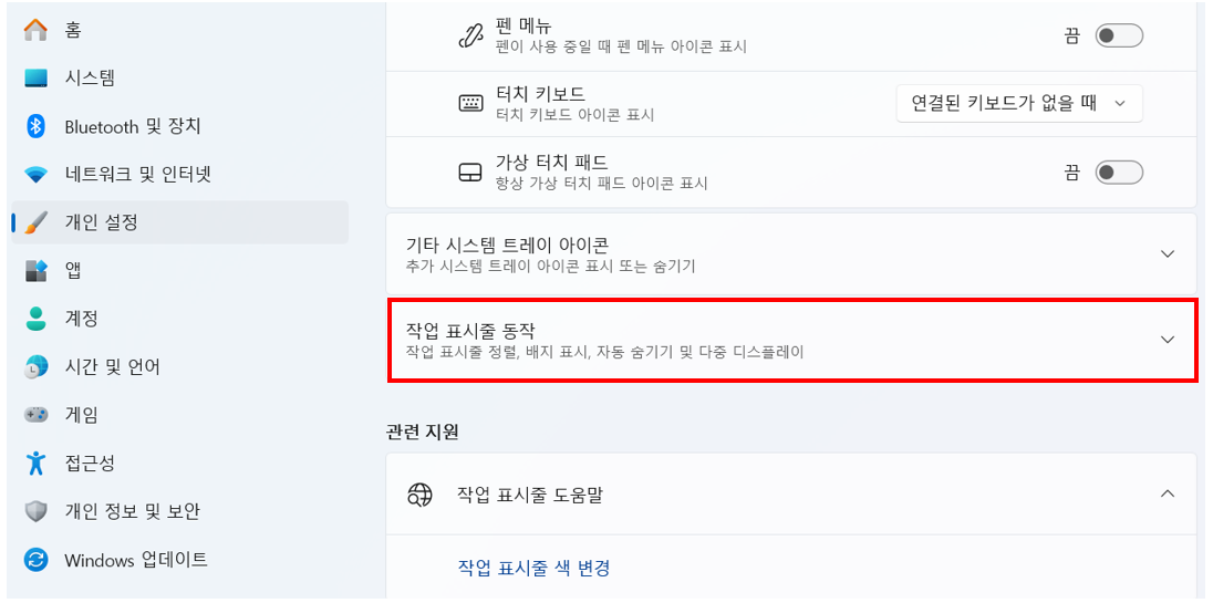 설정 창에서 아래로 스크롤하여 작업 표시줄 동작 섹션을 찾습니다. 이 섹션에서는 작업 표시줄의 다양한 동작 방식을 설정할 수 있습니다.
