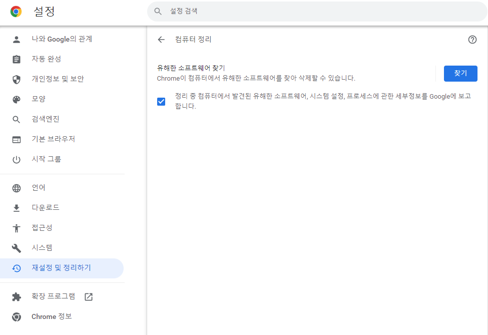 크롬 설정 > 재설정 및 정리하기 > 유해한 소프트웨어 찾기에서 "찾기" 를 클릭합니다.