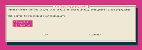 3. 설치 관리자가 phpMyAdmin을 실행하도록 자동으로 구성해야 하는 웹 서버를 선택하라는 메시지를 표시되면 apache2 가 체크되어 있는 것을 확인하고 Enter 키를 누릅니다.