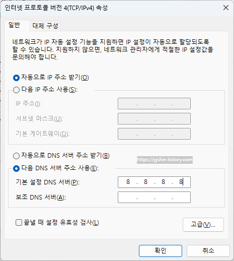 - "다음 DNS 서버 주소를 사용" 라디오 버튼을 선택하고 기본 설정 DNS 서버 8.8.8.8 를 입력합니다.