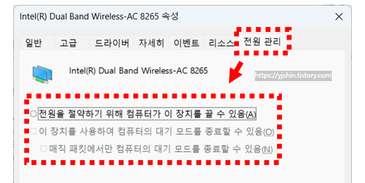 - 속성 탭에서 전원 관리를 선택합니다.