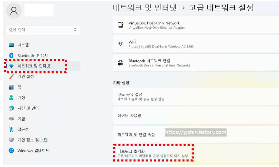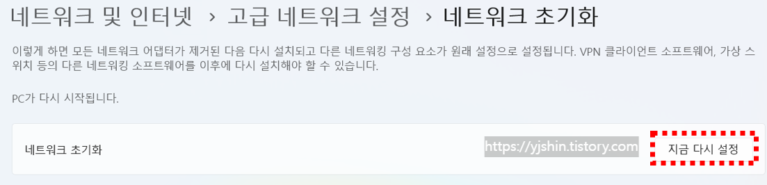 - 마지막으로 '네트워크 초기화' 옆에 있는 '지금 다시 설정'을 클릭하여 네트워크 초기화 재설정합니다.