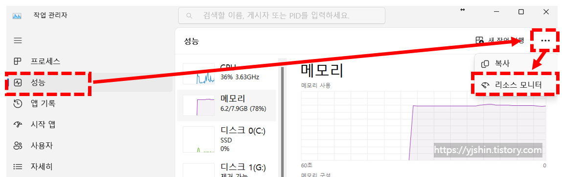 - 성능 탭으로 이동하여 세 개의 점선 메뉴를 클릭한 다음 리소스 모니터 열기를 클릭합니다.