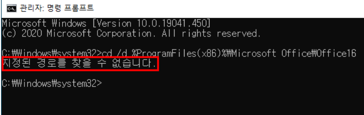 오피스 2019 설치 경로로 이동하기 위해 다음 명령어를 명령 프롬프트 창에 입력합니다.